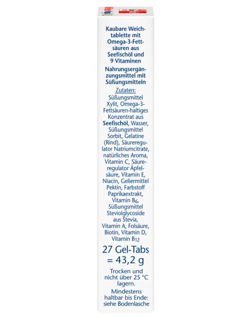 Thành phần: Xylitol, axit béo Omega-3 cô đặc từ dầu cá biển, nước, sorbitol, gelatin (thịt bò), natri citrat, aroma, vitamin C, malic, vitamin E, niacin, pectin, chiết xuất ớt bột, vitamin B6, steviol glycosides từ cỏ ngọt, vitamin A, axit folic, biotin, vitamin D, vitamin B12.