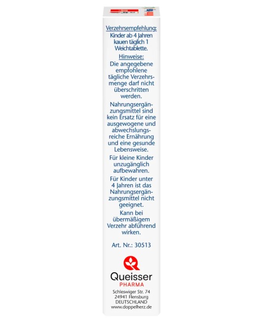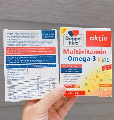 Viên nhai Doppelherz Multivitamin + Omega 3 Kids giúp bổ sung vitamin và omega-3, là một giải pháp tiện lợi hỗ trợ toàn diện về thể chất và trí não cho trẻ em. Mỗi viên nén mềm chứa axit béo omega-3 EPA và DHA, cùng 9 loại vitamin thiết yếu: biotin, axit folic, niacin và vitamin A, C, D, E, B6 và B12. Giúp trẻ ăn ngon miệng, tăng sức đề kháng, hỗ trợ hệ xương phát triển chiều cao, tăng cường thể chất, hỗ trợ trí não, tăng khả năng tập trung… Viên nhai dẻo hương vị trái cây Tutti-frutti thơm ngon và kết cấu mềm mại, lý tưởng cho bé sử dụng hàng ngày. Không chứa lactose, không gluten.