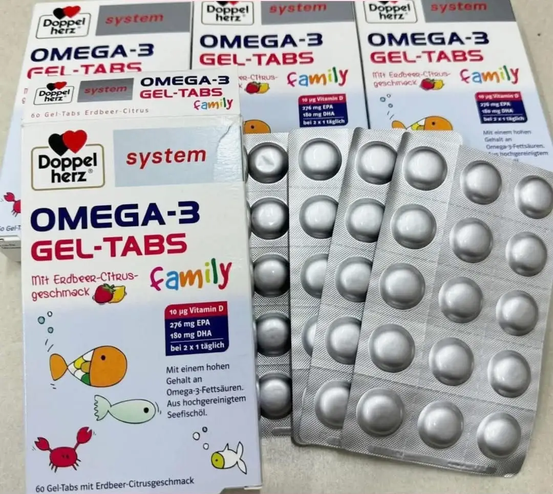 Viên nhai OMEGA-3 Family của hãng Doppelherz system có hàm lượng cao axit béo omega-3 EPA và DHA cần thiết cho trẻ em trong quá trình phát triển thị lực, trí thông minh và việc duy trì các hoạt động bình thường của não bộ người già. Sản phẩm được sản xuất kết hợp omega-3 EPA và DHA ở dạng viên nhai hương vị trái cây thơm ngon. Sản phẩm dùng cho cả trẻ em, thanh thiếu niên với người lớn.