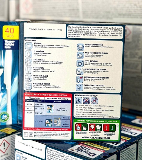 Viên rửa bát Denkmit Geschirr-Reiniger Multi-Power tích hợp 3 thành phần: làm sạch, làm bóng, chống đóng cặn, đảm bảo hiệu quả làm sạch tối ưu, ngay cả với những vết bẩn cứng đầu, đồng thời nhẹ nhàng với chén đĩa và đồ trang trí. Nhờ màng tan trong nước, chúng cũng dễ sử dụng và tiện lợi – cho sự sạch sẽ hoàn hảo và độ sáng bóng tuyệt vời. Phù hợp với mọi loại máy rửa bát và mọi loại nước.