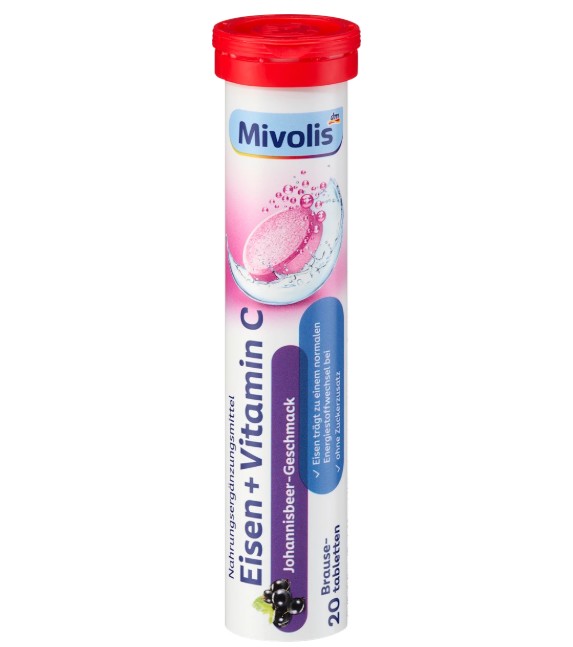 Viên sủi bổ sung sắt và vitamin C Mivolis Eisen + Vitamin C, cung cấp 14mg sắt và 134mg vitamin C trong mỗi viên sủi. Góp phần hình thành tế bào máu, tăng cường hệ thống miễn dịch, ngăn ngừa thiếu máu do thiếu sắt. Cùng với vitamin C – là chất kích hoạt enzyme và bảo vệ các vitamin khác khỏi bị tiêu hủy, thúc đẩy sự hình thành collagen, tham gia vào quá trình chuyển hóa cholesterol và bài tiết chất độc ra khỏi cơ thể, phòng chống ung thư, ngăn ngừa lão hóa và nám da, tăng sức đề kháng của cơ thể…