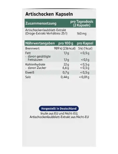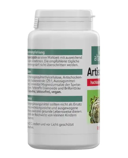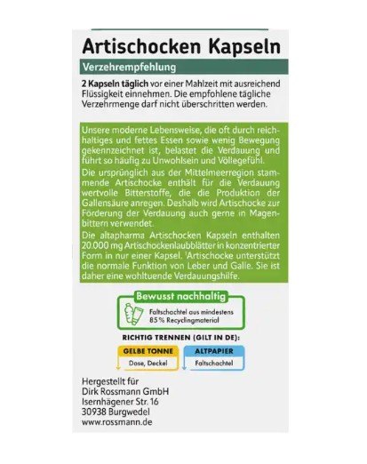 Viên uống altapharma Artischocken Kapseln chứa 9000 mg lá atiso ở dạng cô đặc chỉ trong một viên nang. Chúng hỗ trợ tiêu hóa chất béo theo cách tự nhiên, giảm đầy hơi khó tiêu và rất quan trọng đối với hoạt động của mật và gan. Bảo vệ và duy trì chức năng gan mật khỏe mạnh.