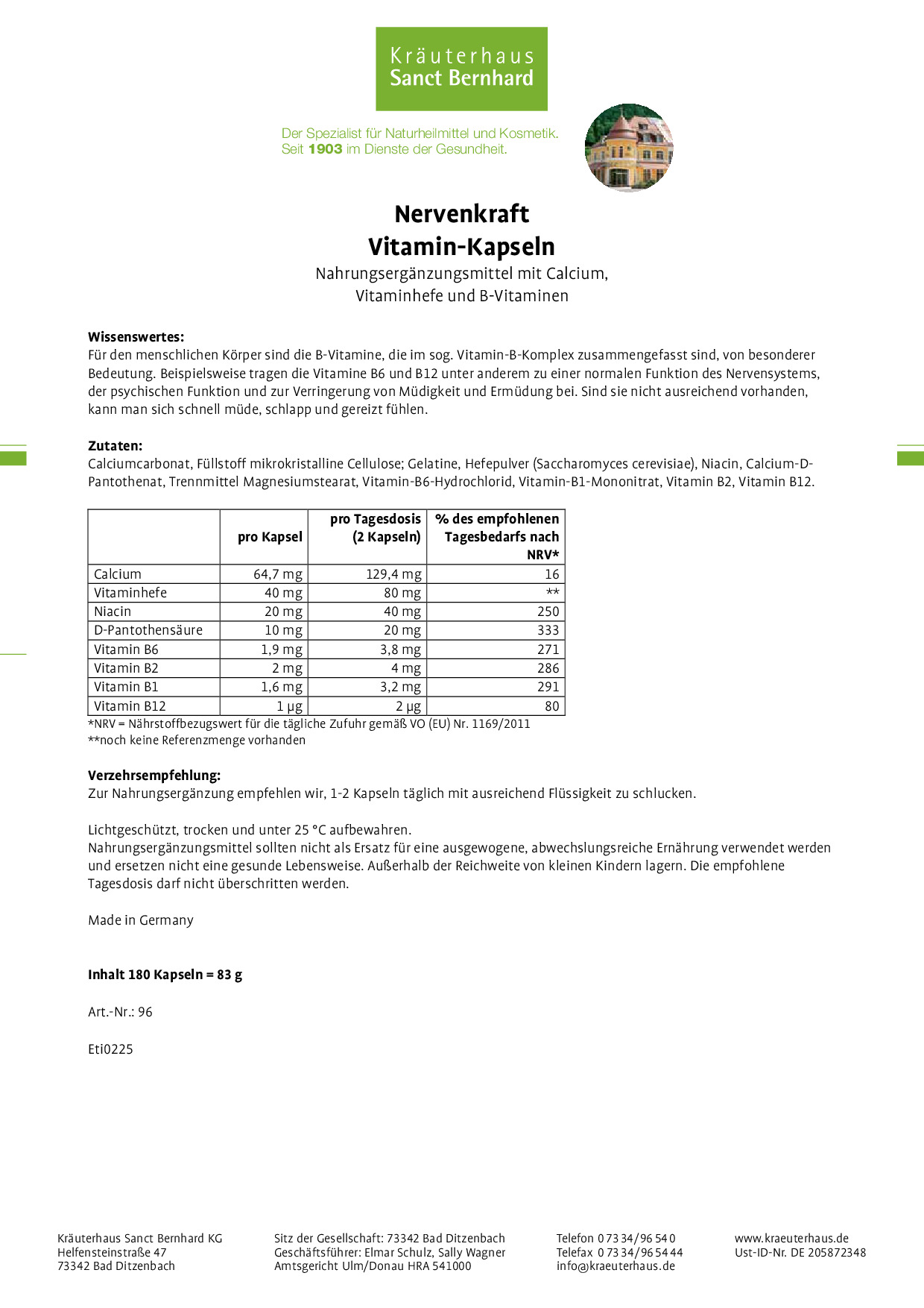 Viên uống bổ thần kinh Sanct Bernhard Nervenkraft Vitamin Kapseln chứa phức hợp vitamin B gồm B1, B2, B6, B12 và vitamin chiết xuất từ nấm men, giúp hỗ trợ sức khỏe thể chất, hệ thần kinh và sức khỏe tâm lý khỏe mạnh, giảm căng thẳng mệt mỏi, lo âu, mất ngủ… Đồng thời chứa canxi cho sức khỏe hệ cơ xương.