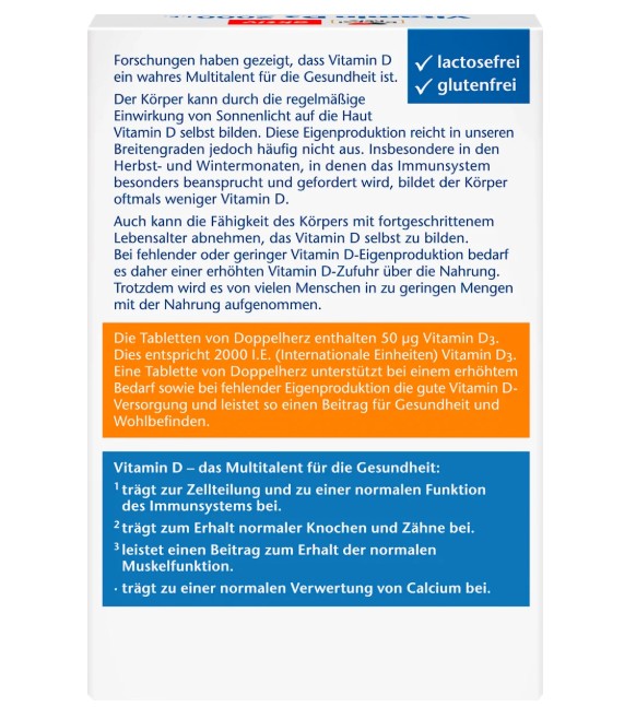 Viên uống Doppelherz Vitamin D3 2000 I.E. cung cấp hàm lượng cao 2000 I.E. vitamin D3, góp phần vào hoạt động của hệ thống miễn dịch, duy trì hệ xương răng, chức năng cơ, và kiểm soát sự tiêu thụ canxi trong cơ thể. Không chứa gluten và lactose.
