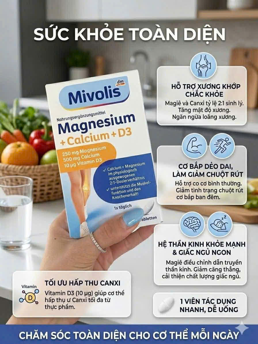 Viên uống Mivolis Magnesium + Calcium + D3 giúp bổ sung khoáng chất canxi và magie với tỷ lệ cân bằng sinh lý 2:1, cùng vitamin D3 giúp hấp thụ canxi tối ưu, tránh lắng đọng canxi, đồng thời tăng hiệu quả bổ trợ các thành phần. Hỗ trợ hệ cơ xương khớp và hệ thần kinh, tăng sức đề kháng cho cơ thể khỏe mạnh.